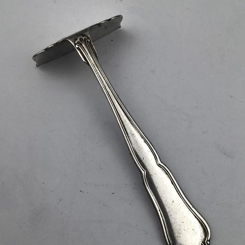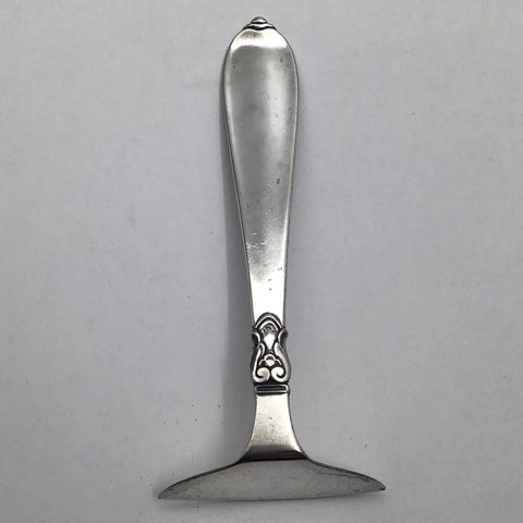 Sølv Baby Skubber med Hjerte. Måler 9,5 cm. Mærket RR, antagelig R. Rasmussen, Stege