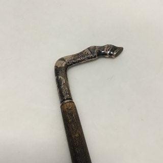 Engelsk læderbetrukket kavelleristok i træ. Påmonteret en aftagelig sølvring med sabel og gevær i relief. Ringen indgraveret med initialer EJJ samt 11.59. L: 71,5 cm
