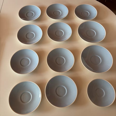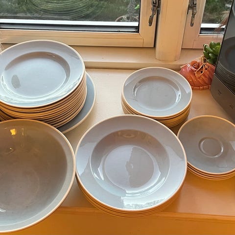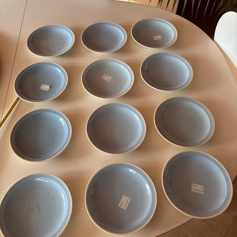 9 dybe tallerkener med en diameter på 21 cm. Flere har synlige brugsspor, men andre er pæne i glasuren. Sælges samlet for 250 kr. enkeltprisen for de pæne er 50 kr. og for de knap så pæne 30 kr.