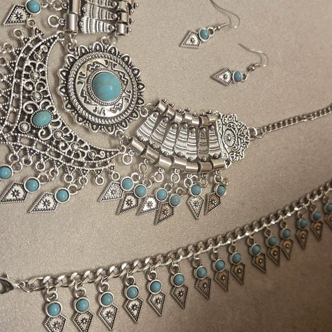 Smuk unik smykke sæt, med halskæde og øreringe, matriale ukendt, nyt, sælges for kun 200kr, kan også sendes med posten for +50kr