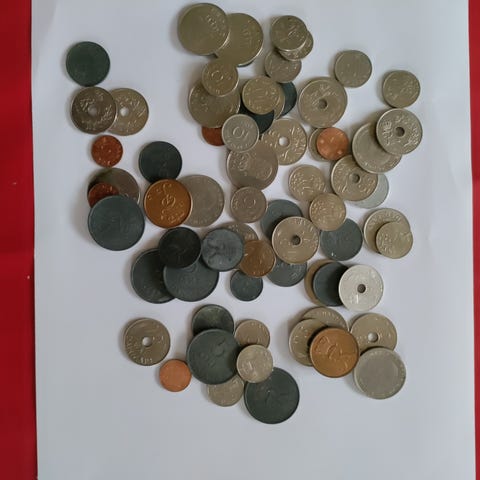 Fra sparegrisen ,25øre 50øre 1 cent 2cent 5 cent m.m