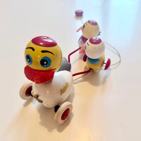 Brugsspor efter leg, men intakt i hjul og hovedet drejer som det skal, når Elefanten trækkes afsted i snor, ørerne er intakte og kan bevæges.