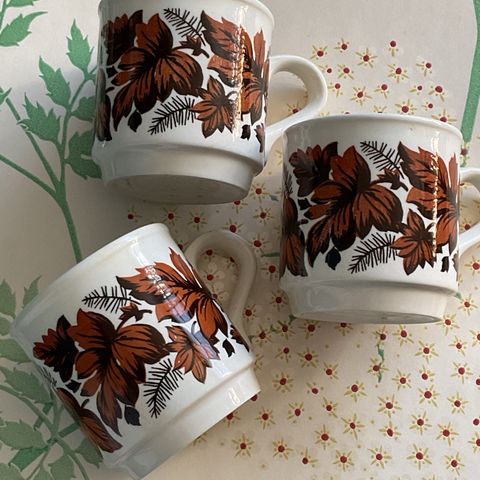 Nydeligt te krus med grønne blade og gule og blå blomster.
