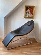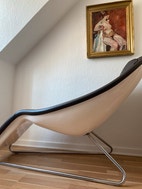 Mazzer har med denne lænestol skabt en flot “flyder” i en skal af glasfiber og sæde af brunt læder, samt et stel af stål / krom.