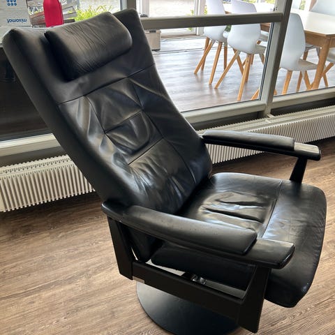 Sort smukt kuntlæder. Stolen kan vippe og dreje. Yderst behagelig stol. Fylder ikke meget.