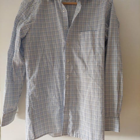 Jeg har taget mange billeder af skjorten, og nærbillederne gengiver bedst farver og mønster. Se derfor især nærbillederne.