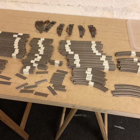 Bodan, H0 træskinner og en stopbom og et sjældent krydsspor, samt meget sjældne skiftespor