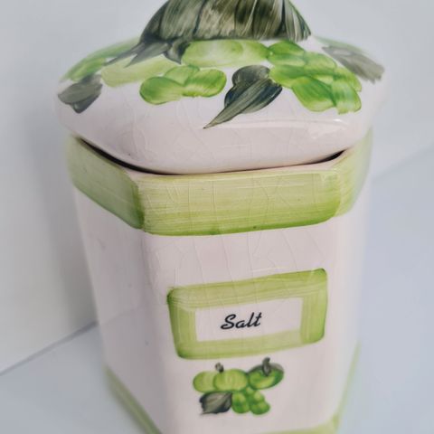 Retro opbevaringskrukke i hvid med teksten Hjortetaksalt og et sort låg
