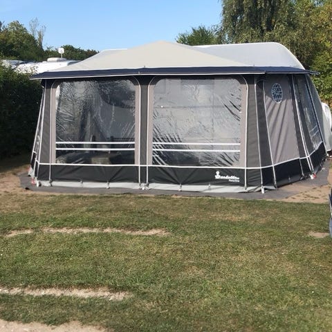 Fin stand men har nogle brugsspor oven på taget ved syninger (se billeder). Rigtig fin stand indvendigt og ingen skader. Vinduerne er klare og som nye.