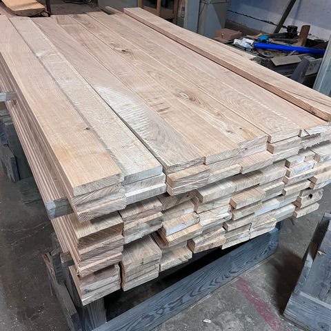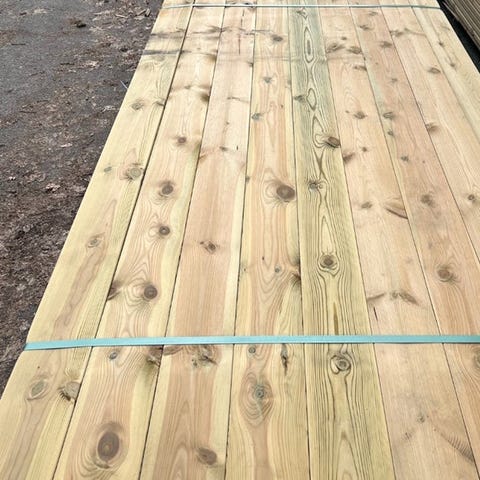 Terrassen er i dag bygget til målene 6x9 m, brædderne er primært i 4 m længder og delvist i 1 m stykker. Klemmer og skruer til fastgørelse følger med.