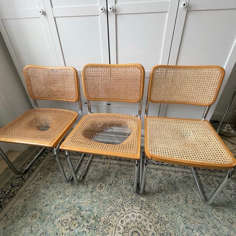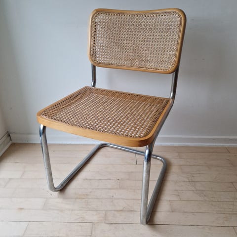 Med stel af forkromet stål - Sæde og ryg i bøgetræ og Fransk flet - H: 45 B: 46 D: 41 cm - I meget god stand.
