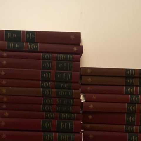 Forlag: Gyldendal - Udgivet år: 1928-1930 - Antal bind: 53 - Indbinding: Lyse halvlæderbind - Tilstand: Eksemplar med brugsspor (slid på ryggen).