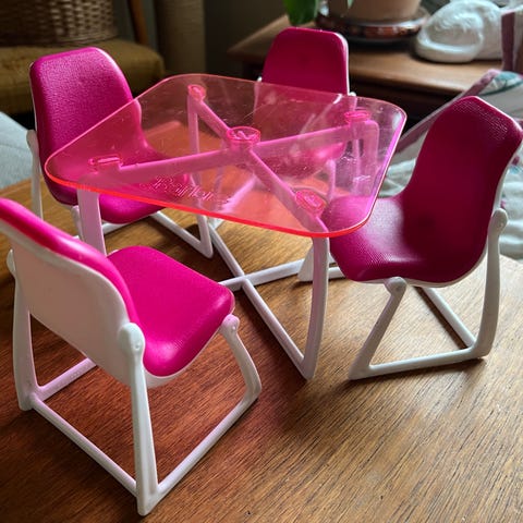 Barbie, Mattel 1994, Vintage dukkehusmøbler bestående af : høj stol, reol, amerikansk køleskab samt basketkurv