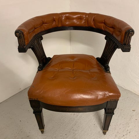 Håndudskåret antik stol i træ og læder m tilhørende bord