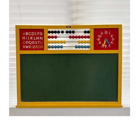 Smuk gammel kridt tavle med ur, tællekugler og abc. To øjer til ophæng.