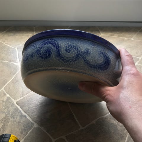 Fin skål, glat indvendig mens med motiv (impression) og materet overflade langs hele siden. Desværre umærket. Formodet svensk.