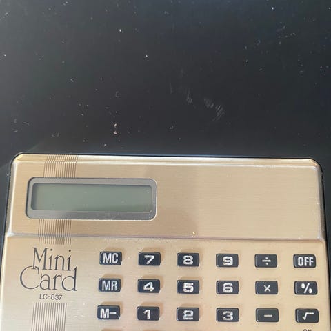 Visitkortlommeregner, med reklame for Provinsbanken. Med solceller. Ca. 1985. Måler 8,4 x 5,3 cm.