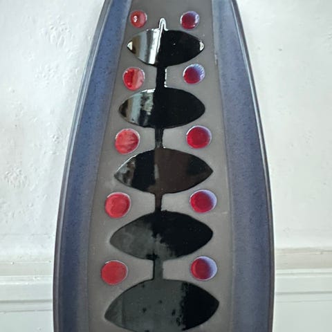 Stort fad fra 1960'erne. Det er fra Knapstrup designet af Günter Praschak og er i lys blå og beige farver, det er ca 29 cm i diameter og 5 cm højt.
