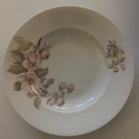 1 Stor suppeterrin, 9 dybe tallerkener, 1 kartoffel skål, 1 sovsekande, 3 fade, hvor det største måler L: 42,5 B: 28. 2 skåle. Kan sendes, på købers risiko. Vil blive pakket rigtigt godt ind.