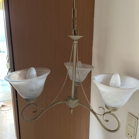 Fin lampe med tre pærer. Længden på ledningerne kan justeres ovenpå lampen, så de passer til rummet. Sælges fordi vi er flyttet og ikke kan finde plads til lampen, og billedet snyder derfor lidt i perspektivet, fordi den ikke pt er hængt op - pladen er 25 cm og den længste ledning aktuelt 70 cm. Der medfølger tre dekorative pærer 12 cm i diameter.