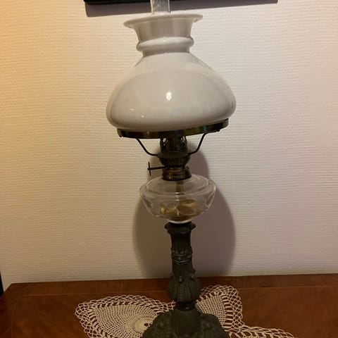 Fanø messing olielampe med hvidt glas. Denne lampe kombinerer et klassisk håndlavet design med holdbare materialer. Ideel til dekorative formål eller som en funktionel lyskilde i hjemmet. Den messingfarvede base giver en elegant finish, mens det hvide glas skaber en blød og behagelig belysning.