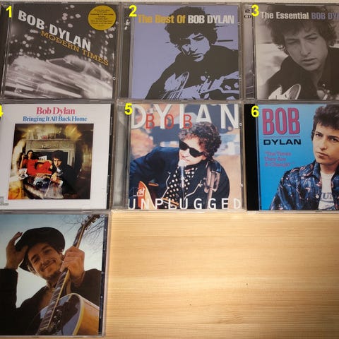 Bob Dylan CD samling med forskellige musikalbums. Indeholder flere af Bob Dylans kendte værker. Perfekt til musikelskere og samlere, der ønsker at nyde klassisk rock og folkemusik.