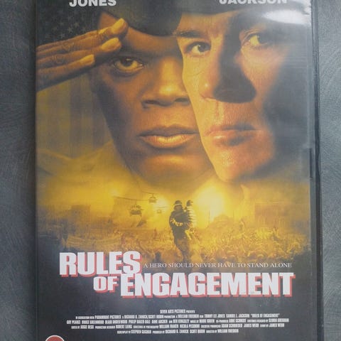 Rules of engagement, instruktør Dansk tekst, DVD, thriller, USAs ambassade i Yemen er under belejring af vrede demonstranter, og den højtdekorerede Oberst Terry Childers (Samuel L. Jackson) og hans marinesoldater sendes ind for at evakuere diplomaterne. Soldaterne kommer under beskydning, hvorefter Childers giver ordre til at åbne ild og massakrerer derved en flok - tilsyneladende - ubevæbnede demonstranter. Politisk set en varm kartoffel og USAs regering behøver en syndebuk. Childers stilles for en millitærdomstol anklaget for mord. Han søger hjælp hos sin gamle krigskammerat Hays Hodges (Tommy Lee Jones), en bitter, nypensioneret Army-sagfører, hvis liv Childers reddede i Vietnam. Nu skal tjenesten betales tilbage. Er Childers en koldblodig morder, eller har han blot fulgt spillets regler?