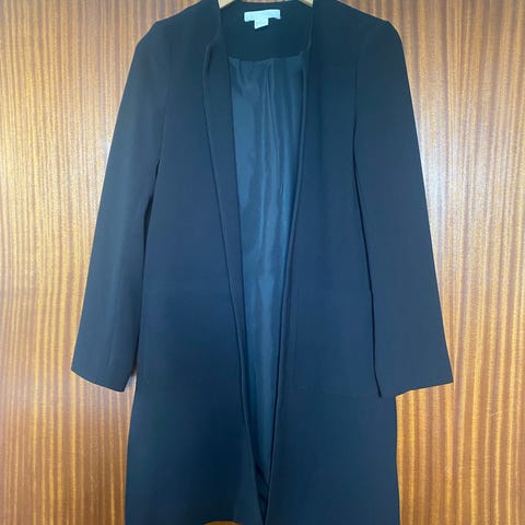 Meleret sort/grå lang blazer jakke fra HM str M. Ca 80 cm lang og uden for i. Brugt en del, men pæn.