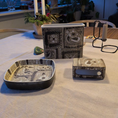 Motivet forestiller en dekorativ ugle i dybe, håndmalede farver – et klassisk eksempel på hendes arbejde i den ikoniske Baca-serie fra 60’erne/70’erne.