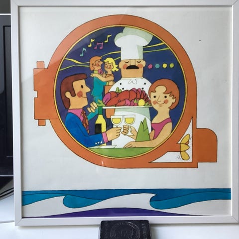 Reproduktion af reklametegning af Ib Antoni fra 1958 for den danske regnfrakkeproducent KAWO.