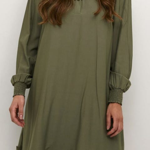 Anden kjole, Culture, str. L, Blågrå, Bomuld, Næsten som ny, Småmønstret kjole i blågrå nuancer, krave og korte ærmer. Lukning hele vejen ned foran med runde knapper betrukket med hvid garn-hækling.