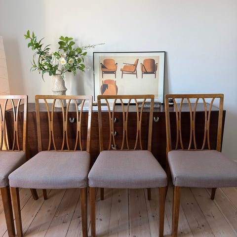 6 Træ spisestuestole med grå polstring. Stolenes design kombinerer lyst træ med grå stofsæder og ryglæn. Velegnet til spisebordssæt og tilbyder komfortabel siddeplads til daglig brug.