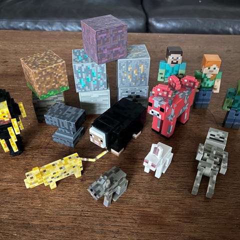 Minecraft figursæt med 7 stk figurer med klods ved siden af