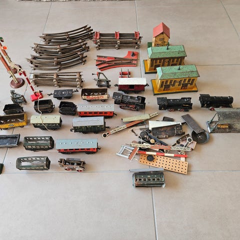Har en del togskinner samt 3 modeltoge til salg. de har stået på et loft, hvor de øverst er ramt af noget rust, men kan nemt slibes.