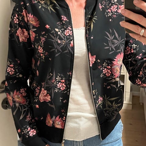 Let bomber jakke str S/M med fugle og blomster.