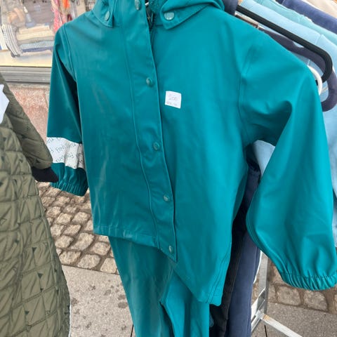 Freds world by Green Cotton Regnsæt Str 128 cm. Kun brugt meget lidt ingen brugsspor. Hætten kan tages af og der er elastikker der går under fødderne. Ingen oplysning om vandsøjletryk