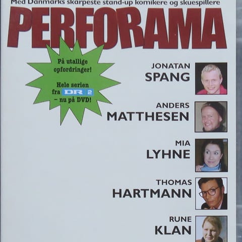 PERFORAMA (UÅBNET, stadig i folie), instruktør Pelle Møller, DVD, TV-serier, Hele serien. Fra 2002. Med bl.a. Anders Matthesen, Mia Lyhne, Lykke Scheuer, Per Scheel Krüger, Jack Arnold, Thomas Levin, Jonatan Spang, Finn Storgaard, Per Pallesen, Thomas Hartmann, Rune Klan og Pernille Aalund.