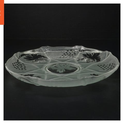 Flot glasfad med bølget kant og indgraveret blomsterdekoration.
