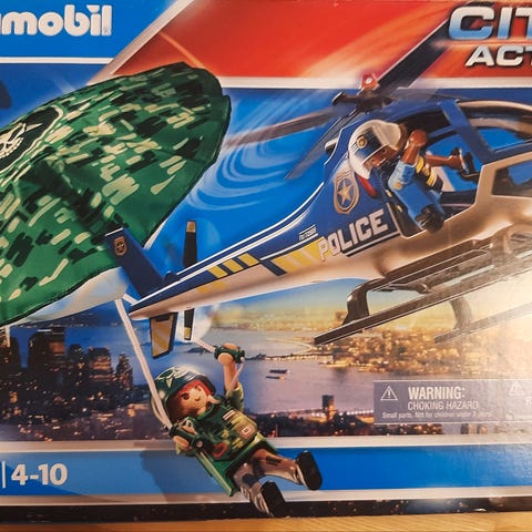 Politi/redningshelikopteren har en indbygget, fungerende reblift, cockpitfront, der kan åbnes, så man kan lege og siddeplads til op til tre figurer. Sættet er komplet med 2 betjente og diverse tilbehør og fremstår som nyt. Se evt detaljer på de sidste 4 lånebilleder.