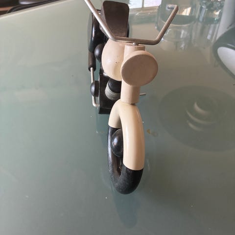 Motorcykel, Trælegetøj, Ukendt, Træmotorcykel fra midten af 1900-tallet. Bytter gerne med gammel ting/legetøj lavet af Hans Bølling og Kay Bojesen.