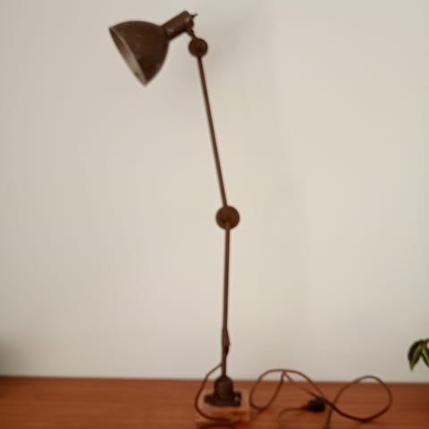 Søgeord: arbejdslampe, bordlampe, skrivebordslampe, værkstedslampe, retro, gammel, rå, jern.