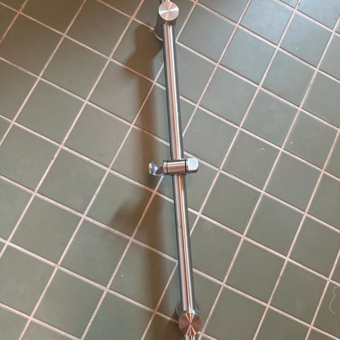 Næsten ubrugt brusestang - blankpoleret krom. Passer til de fleste brusehoveder og blandingsapparater.