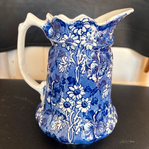 Sjælden engelsk porcelænskande med låg. Den er af typen Jackfield, navngivet efter byen i Shropshire, hvor produktionenen foregik. Den er glaseret med sort blyglasur, hvorfor det også kaldtes Blackware. Den er victoriansk i stilen og er fra omkring 1880. Altså ca 145 år gammel. Kanden er udsmykket med blomster i hvidt og guld og den er forsynet med et hængslet tinlåg. Det skyldes, at den var beregnet til varmt vand i fornemme hjem, og låget gjorde, at vandet holdt sig varmt længere. Højden er 20 cm og diameter 14 cm + hanken. Den er helt uden skader. Står på Mols men kan gratis leveres I Aarhus og Ebeltoft eller sendes billigt på købers regning