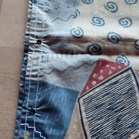 Helt sæt gardiner i blå med hvidt mønster. Ekstra glidere medfølger. Der mangler 6 “tunger” som du evt selv kan sy. Det er tunger til at sætte omkring gardinerne når de er trukket fra.