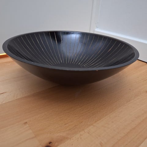 Flot rund dekorationsskpl med trælignende blank lakeret overflade. Rødlig. Perfekt som borddekoration til feks. tørrede blomster eller kunstige blomster. Den har filtdupper i bunden for at beskytte overflader. Højden er ca 18 cm og diameteren er ca 30 cm. Også fin til opbevaring af ledninger osv...