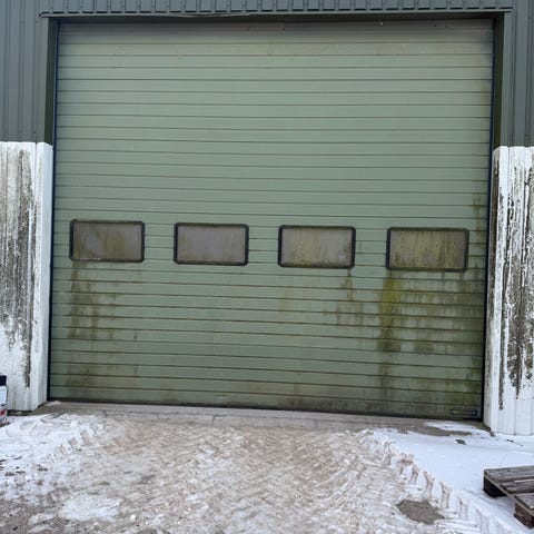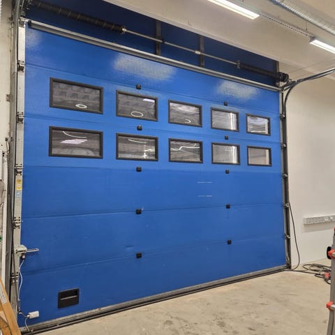 Elektrisk drevet port, 5 m åbning. Påkørt, derfor en lille bule på porten (se billede) Bundplade lettere bøjet og en fotocelle defekt.