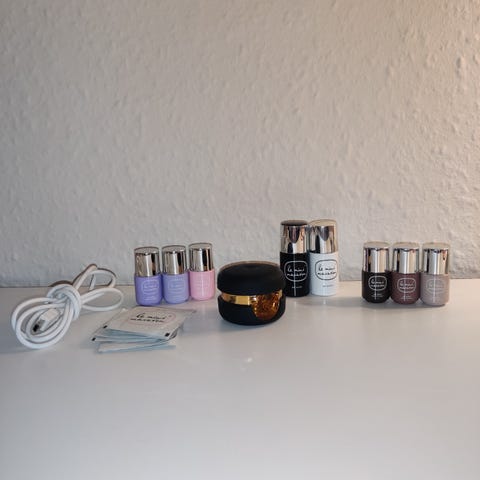 Sæt med ting til at lave gellak sælges. Det er brugt 3 gange.