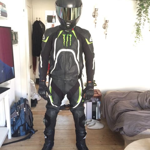 Den har ingen mærker eller skader. Aldrig ramt jorden. Jeg har kørt med den Maks 10 ture. Den er 2 delt med en lynlås så bukser og jakken bliver samlede. Fra et hjem uden dyr og rygning.