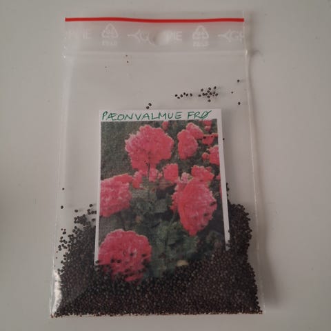 Valmuefrø fra lyserød pæonvalmue. Netop høstet i juli 2025.