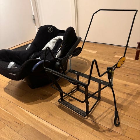 Baby autostol med tilhørende beslag og lille værktøjskit. Autostolen kan nemt afmonteres og påmonteres med de medfølgende beslag så stolen står forsvarlig fast i cyklen. Autostolen er i sort/grå med tilhørende solskærm og med 3-punktsele samt beskyttende indlæg. Selvom autostolen er placeret i kassen er der stadig plads til 2 børn og indkøbsposer.